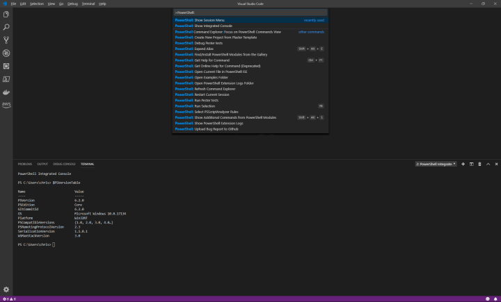 A lot of post I’ve read about this said you can’t easily switch between shells within VS Code however that must have been for previous version or they didn’t know the trick. You need to open the PowerShell Integrated Console and not the default PowerShell terminal in VS Code. We can open the integrated console from the command pallet (Ctrl+Shift+P) then switch between PowerShell 5 and 6.