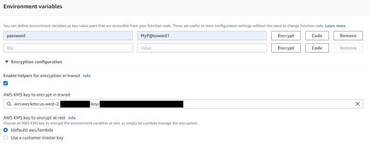 Utilizing the AWS Lambda console when configuring the function, under environment variable, select the option to “Enable helpers for encryption in transit”. You’ll need to provide what KMS key you’ll want to encrypt the value with. When we enter a value and select encrypt the console encrypts the value with KMS and stores the value as an encrypted base 64 text string.